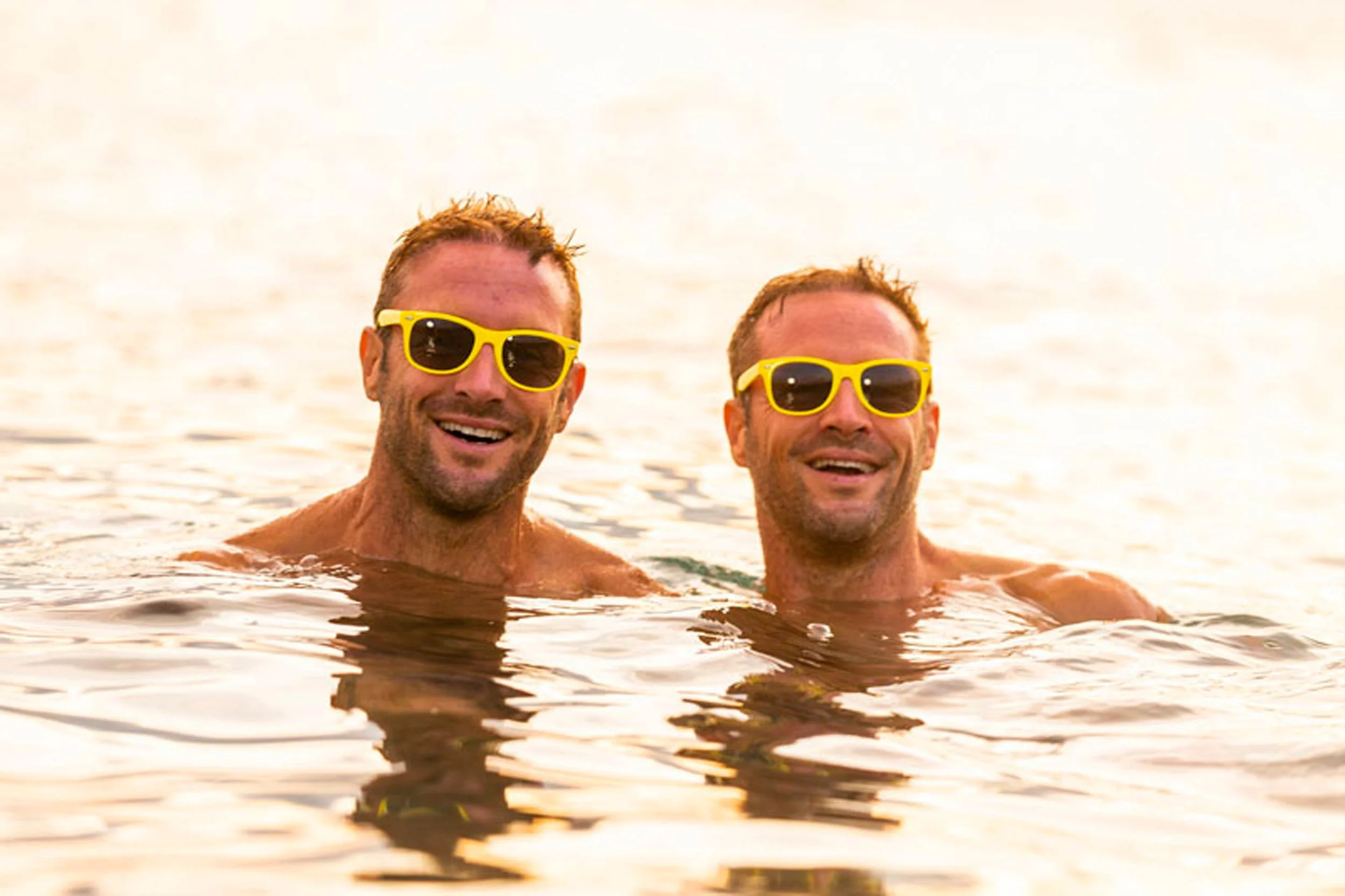 Two men at the beach holding a sign that reads #DipatDawn, wearing sunglasses, with a sunset over the ocean in the background.
